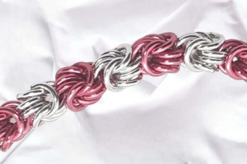 Bright Silver and Deep Pink anodized aluminium rings make up this bracelet - Rosetta weave. It gives the appearance of tiny pink and silver rosettes, very feminine. This bracelet is 200mm in length, if you need it shorter, please email me at shop@minnie-mae.com with the size you would like.