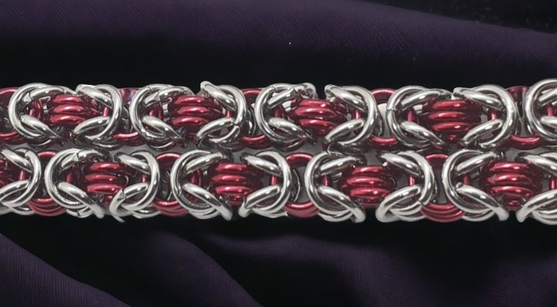 Stainless Steel and Red anodized aluminium rings make up this necklace - Byzantine weave. The stainless steel gives weight and the weave is feminine and feels very comfortable to wear. This necklace is 600mm in length, if you would like shorter, please email shop@minnie-mae.com with the length you would like this necklace. If you would like longer send and email with the length you would like and I will price it for you. You can also choose another colour of your choice, dependent on availablity. See my commissions page.