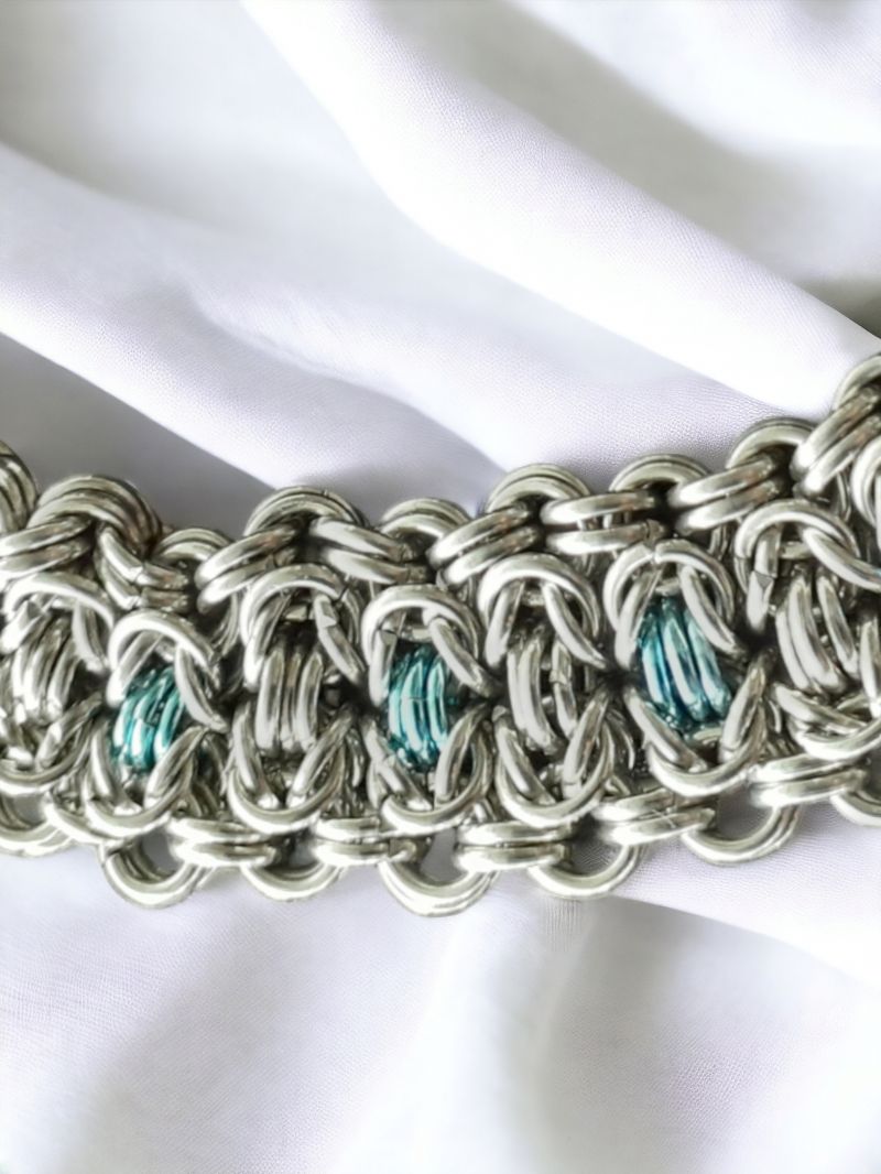 Silver Stainless Steel 1mm rings, with Blue aluminum rings - Byzantine Ladder weave. This bracelet feels beautiful to wear, it's heavy (approx 59g). The clasp in a magnetic slider clasp. Please email shop@minnie-mae.com with the length you would like this bracelet (currently 200 mm, if reduced in size weight will drop).