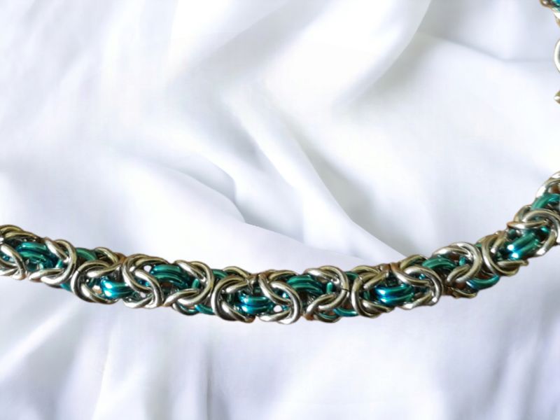Fine and feminine Byzantine Bracelet (micro-chain maille). Stainless Steel 0.08mm (ring size), with Anodized Aluminium 'blue' coloured rings. A lovely bracelet to wear at approx 9g, it's a little heavier (6g more) than full aluminium. With an stainless lobster clasp. Length approx 200mm, if you want smaller please email length before posting.
