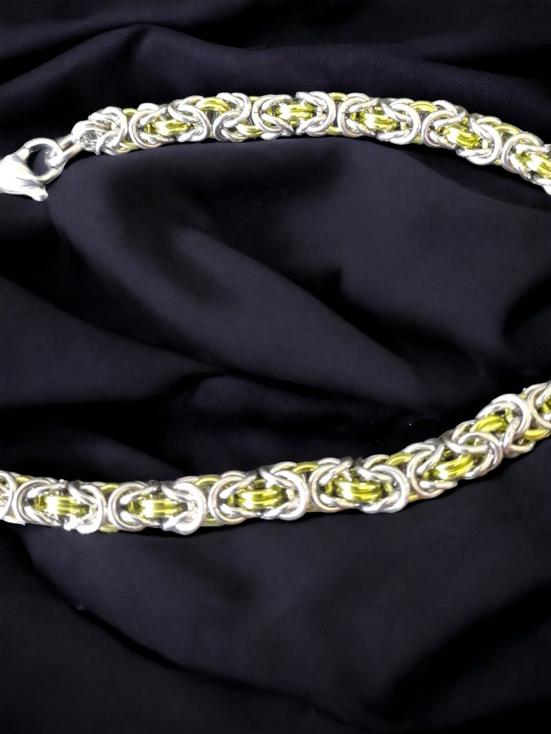 Fine and feminine Byzantine Bracelet (micro-chain maille). Stainless Steel 0.08mm (ring size), with Anodized Aluminium 'lime green' coloured rings. A lovely bracelet to wear at approx 9g, it's a little heavier (6g more) than full aluminium. With an stainless lobster clasp. Length approx 200mm, if you want smaller please email length before posting.