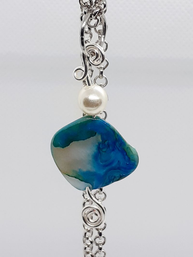 Blue stone with Pearl, silver-coloured wire and chain. Designed to go over your head so no clasps.