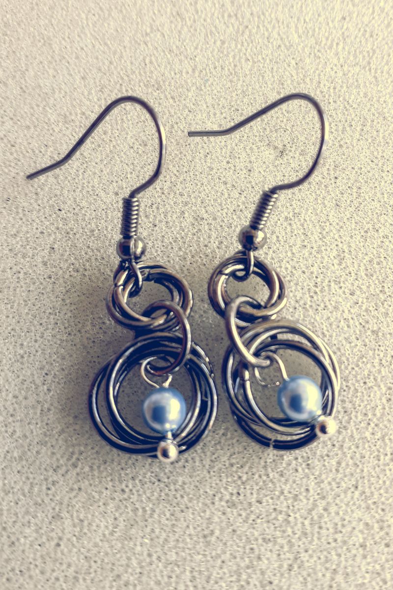 About this piece: Lovely Mobius design earrings, in gunmetal coloured rings with Swarovski® blue pearl.