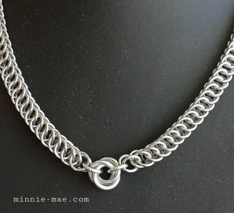 This choker is 1.2mm dark aluminum rings in half persian 4 in 1 weave with a BA Mobius feature.The clasp is handmade and easy to do up. Shown for approx length with mm ruler.