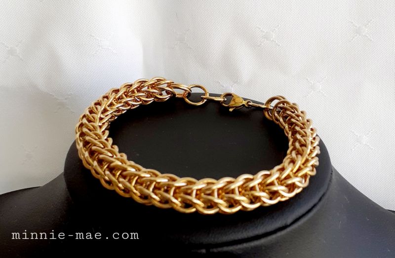 Persian weave Bracelet. Brass rings. A lovely bracelet to wear with a weight of 32g. The clasp is a stainless steel gold coloured lobster clasp. Shown for approx length with mm ruler in images.