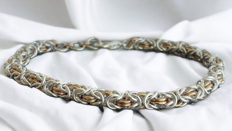 Fine and feminine Byzantine Bracelet (micro-chain maille). Bright Aluminium (BA) 0.08mm (ring size), with Anodized Aluminium 'gold' coloured rings. A lovely bracelet to wear as it's light approx 3g. With an aluminium lobster clasp. Length approx 200mm, if you want smaller please email length before posting.