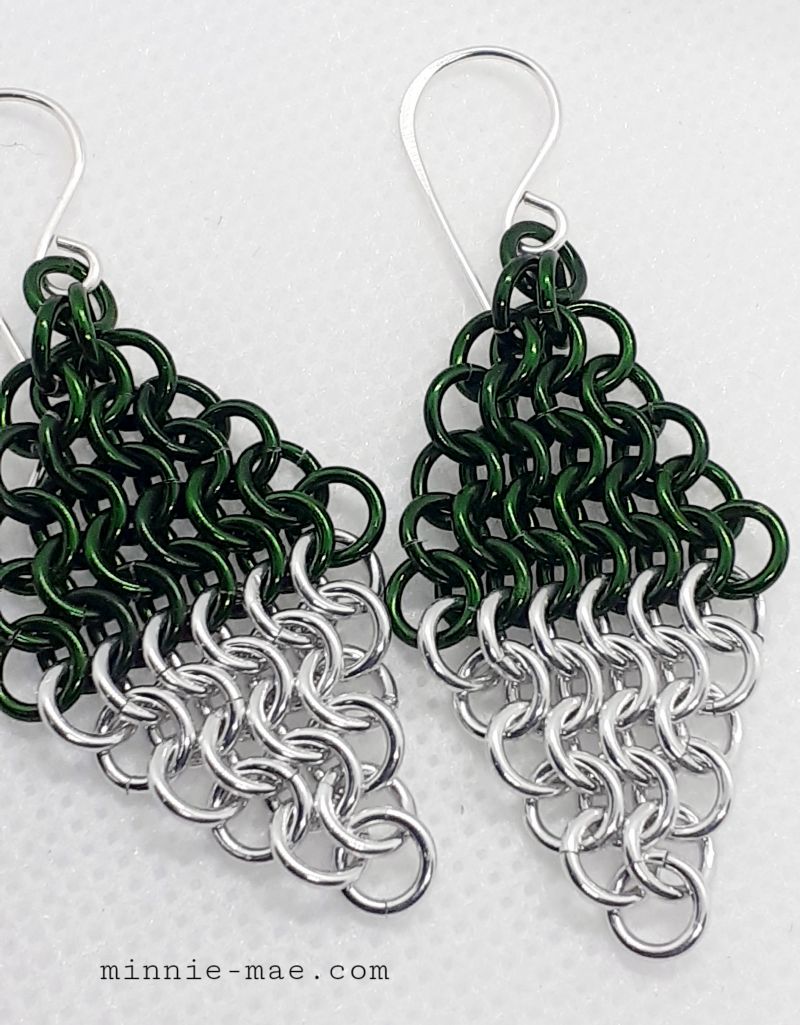 Silver bright aluminium and Green anodized aluminum rings - European 4 in 1 weave. These earrings feel beautiful to wear, they are smart and light on your ears. Approx length 40mm.